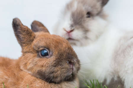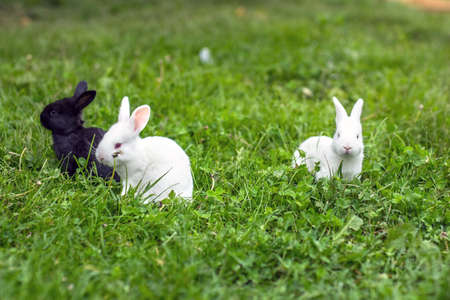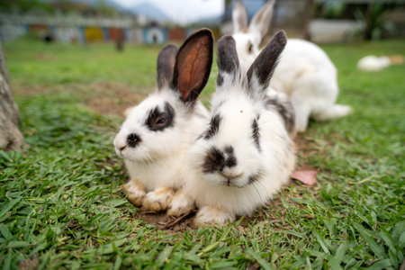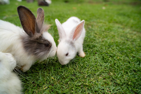 Group of healthy Lovely bunny fluffy rabbits, Adorable baby rabbit on green garden nature background