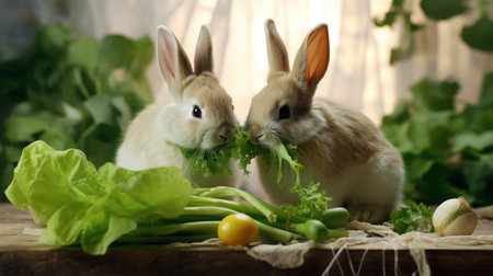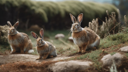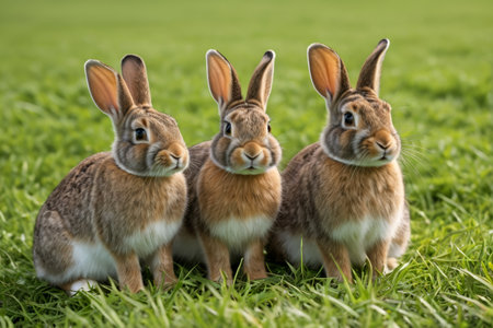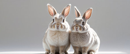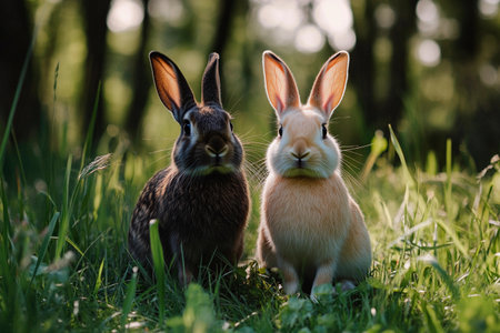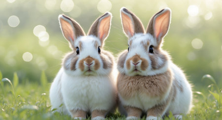 AI Generated. two rabbits sitting in the grass looking at the camera