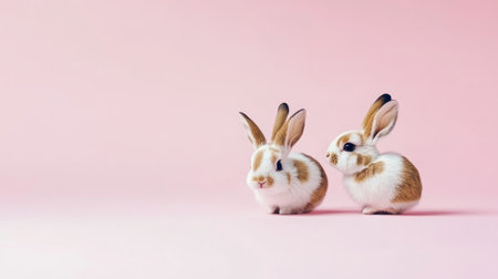 white rabbits and decorative eggs on a soft pink background, evoking a playful Easter and spring celebration theme
