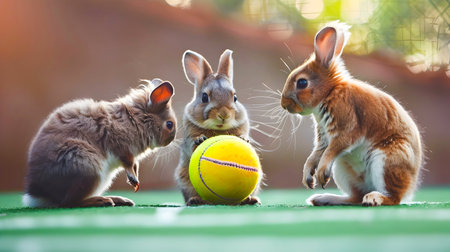 Playful and Energetic Bunnies Engaging in a Friendly Game of Tennis Amidst the Lush Green Outdoor Environment with Warm Lighting and Blurred Background