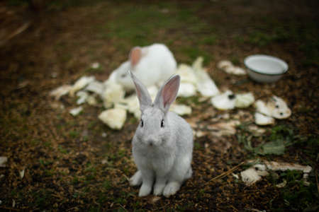 A beautiful grey rabbit looks into the frame. In the background, a white rabbit is eating.