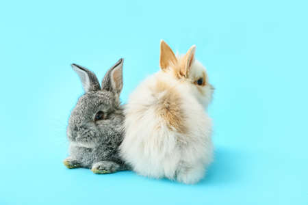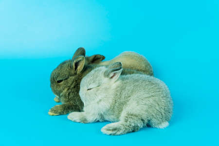 Group of newborn bunny lying down on blue background. Three adorable lovely fluffy rabbit lying together on isolated blue background. Easter animal concept.