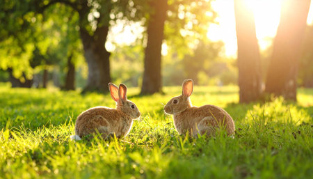 Two brown rabbits face each other in a sun-drenched grassy meadow, framed by trees at golden hour