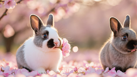 Two adorable bunnies enjoying spring blossom in a beautiful pink flower garden close up