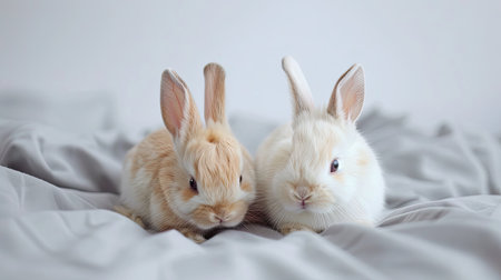 two playful bunnies frolicking on a cozy bed, a light brown, coat while sports white fur with delightful pink ears. Utilize soft pastel colors and evoke a charming cottagecore aesthetic