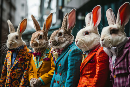 Funny Easter bunnies wearing fancy hipster clothes and sunglasses walking in the city. Rabbits dresses as people in pastel colored outfits celebrating Easter in town. Generative AI.