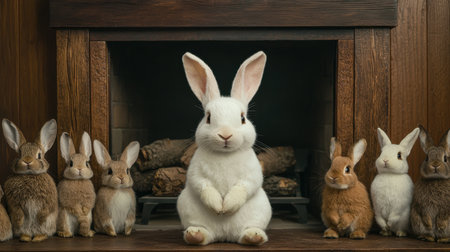 Adorable white rabbit sitting gracefully among brown bunnies in front of a rustic fireplace in a cozy wooden room, festive and charming atmosphere