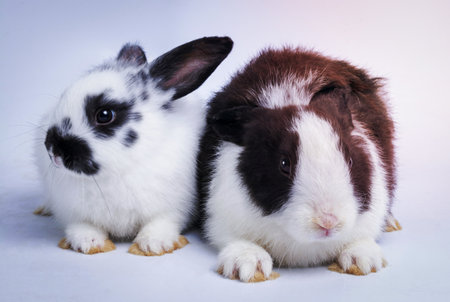 Two cute little rabbits with a black and white pattern on a white background. Pet concept. Easter day