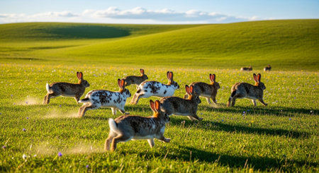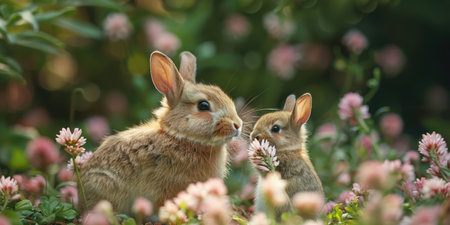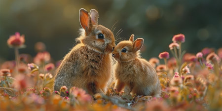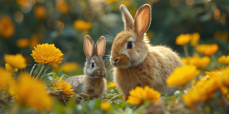 Two Rabbits Hopping Through a Sunny Spring Meadow with Vibrant Flowers. Concept of Nature, Springtime, Wildlife, Tranquility, Freedom, Animal Companionship, Natural Beauty, Peaceful Outdoors.