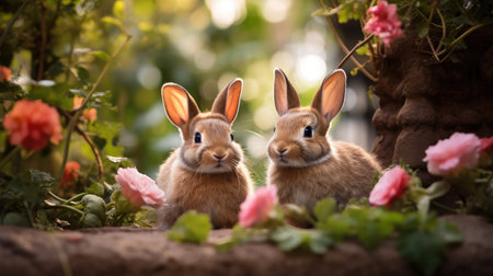 An AI generated illustration of two brown and white rabbits leisurely hopping through a lush garden