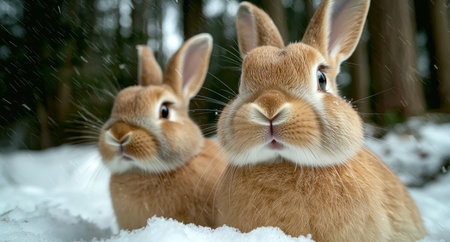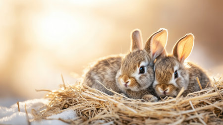 Two adorable baby rabbits relax together in a cozy hay nest, basking in warm sunlight during winter. This heartwarming scene captures innocence and tranquility.