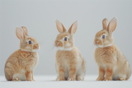 A group of cute little brown rabbits, furry, long ears, sitting on a white background. Pet concept. Herbivorous animals. small mammals