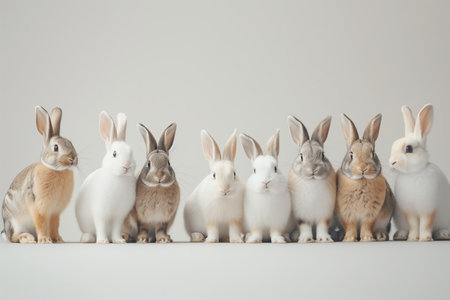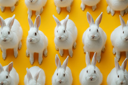 Group of adorable white rabbits standing in a row on a vibrant yellow background