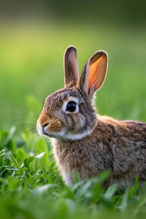 Cute little rabbit in the meadow in summertime. Animal portrait.