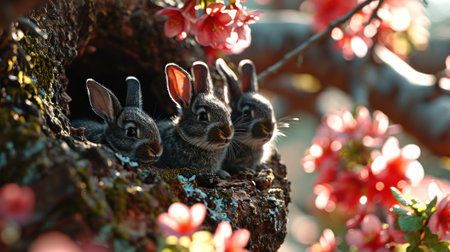 A group of baby rabbits huddled together in a burrow. Concept of warmth and companionship among the rabbits as they rest together in their cozy home