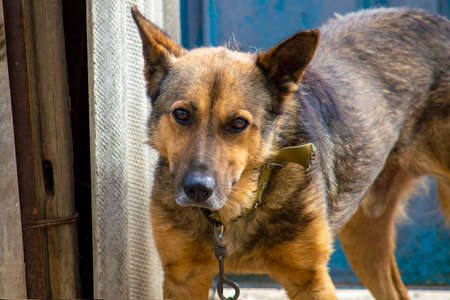 A dog with a vicious grin protects the house from thieves, being behind the fence. Angry dog ​​barks and guards the yard of the house. chain angry dog ​​barks at people, guards the house, animal abuse