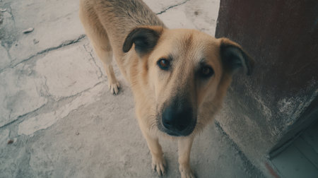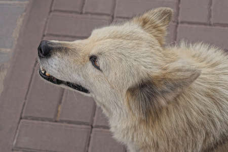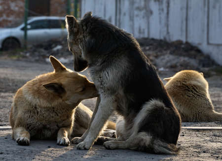 angry hungry stray dogs frolicking in the city center on the sidewalk close-up