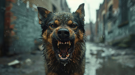 Menacing dog exposing its teeth in a warning pose, muscles tense and eyes focused on a potential threat