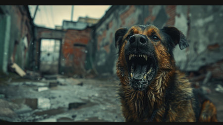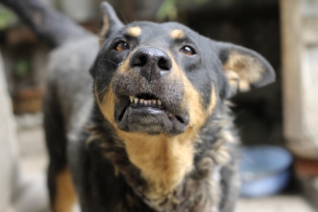 Fierce dog showing its teeth while barking at an intruder, warning to stay away