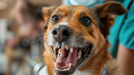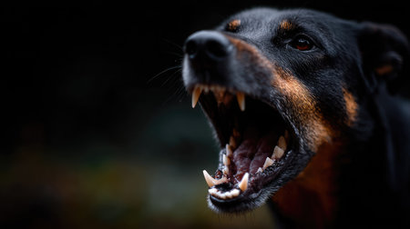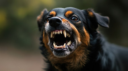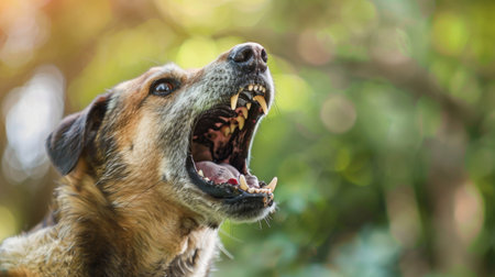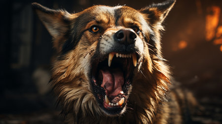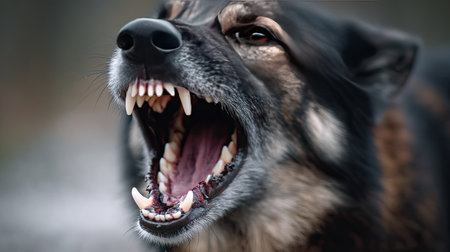 Close-up of an aggressive dog snarling with its mouth wide open, showcasing dangerous teeth and aggression