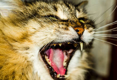 fluffy the cat is yawning open mouth of a cat close-up photo