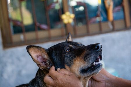 Angry dog bares his teeth Evil Dog, raped dog, Angry Aggressive Mad Dog Concept Of Mad Dog Attack. High quality photo