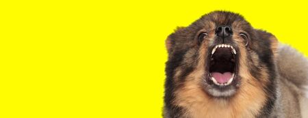 close up of a beautiful spitz dog with brown fur barking mad on yellow studio background