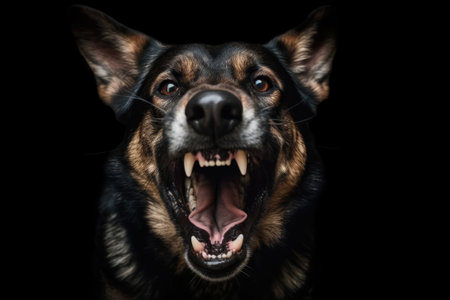 black and tan German Shepherd dog with a menacing snarl and baring its teeth against a black background
