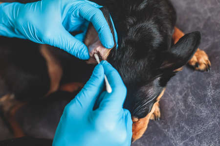 Process of cleaning dog ear, vet cleans dog ears with cotton swab, small breed black dog ear examination close up view at veterinary clinic, pet care and hygiene concept