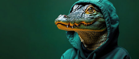 Crocodile in green hoodie, green background, intense and stylish