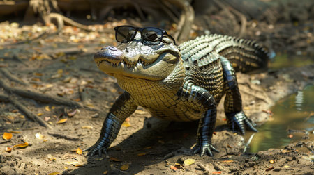 Crocodile with sunglasses on the background of the jungle