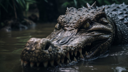 a close-up photo of a dark and ominous great white alligator in water. this captivating image, rendered in cinema4d with vray tracing, showcases the strong facial expression of the alligator. the dark yellow and dark navy tones add to the eerily realistic and visually storytelling nature of the photo. ai generated