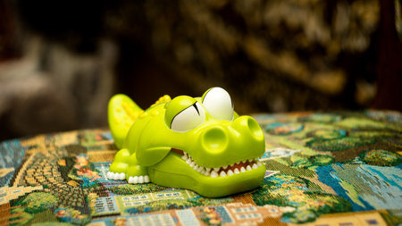 A plastic crocodile toy lying on a chair against a blurry background.