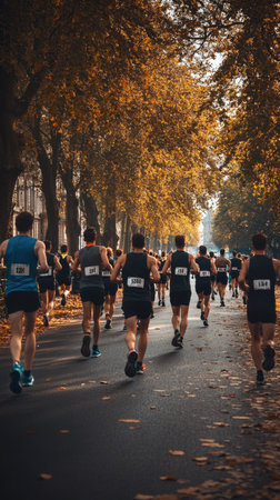 A group of enthusiastic runners jogs down a tree-shaded street, surrounded by vibrant autumn foliage, during a community marathon event in the morning light.