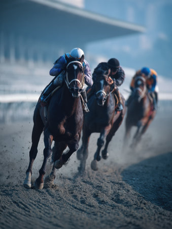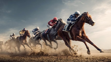 A dynamic scene captures a thrilling horse race, showcasing jockeys in colorful attire as they expertly navigate a dusty track under a dramatic sky.