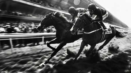 Striking black-and-white i,age with focused jockey and horse in motion, competing for the victory among other athletes.