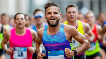 Runners are joyfully participating in a marathon, showcasing determination and teamwork in a bustling city environment, surrounded by cheering spectators and vibrant attire. Generated AI. This is a fictional character not a real person