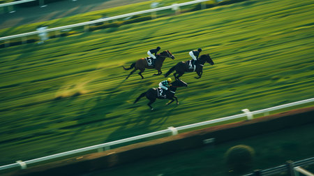 Jockeys are riding their horses during a fast paced horse race, creating a dynamic motion blur effect