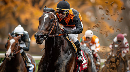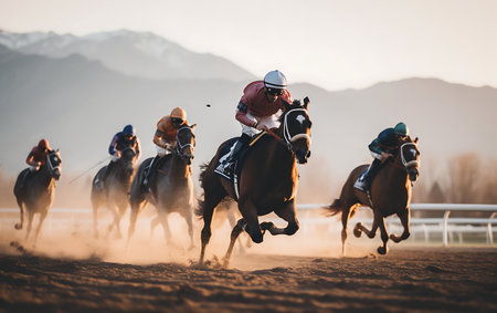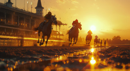 A racehorse gallops fervently on a dirt track, splattering mud as it speeds towards the finish line. Jockeys exert their strength while competing in a vibrant race against a backdrop of shimmering golden hour sunlight.