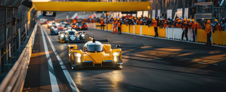 Group of race cars competing on track with people, spectators watching on tribune. Focus on leading yellow car