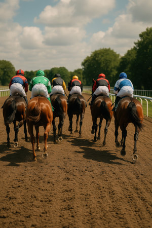 Rear view of galloping horses and colorful jockeys speeding down dirt surrounded by trees and clouds. Kentucky Derby, horse race, competition event, sport