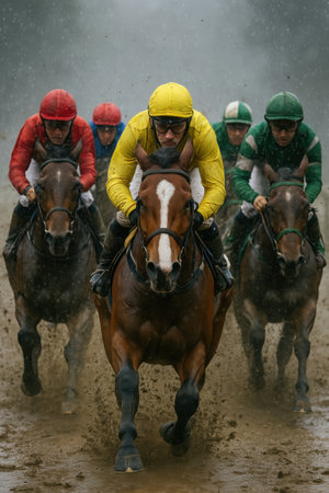 Focused jockeys in colorful uniforms racing their horses through the muddy track, competing for the victory. Kentucky Derby, horse race, competition event, sport