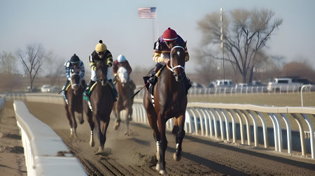 Thrilling Horse Race in Early Morning Light at Local Racetrack Competing for Victory