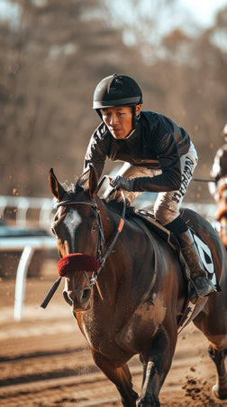 Asian male jockey in racing gear riding a horse. Concept of horse racing, equestrian sport, competitive jockey, athlete. Vertical.