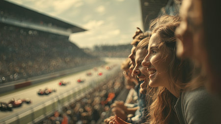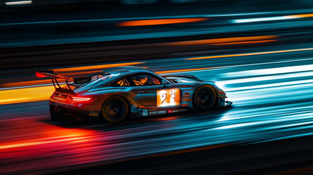 Fast moving cars generating vibrant streaks of light and motion blur, racing around a high speed circuit with spectators filling the grandstands, emphasizing speed and excitement