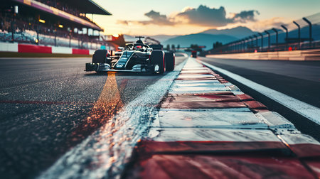 A dynamic side view of a race car speeding past the camera, showcasing motion blur and excitement on the track. Perfect for capturing the thrill of racing.
