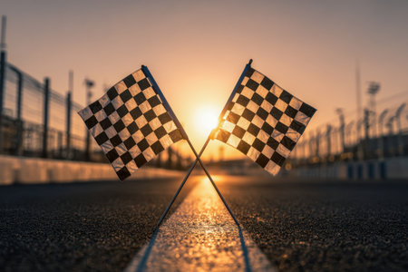 Vibrant checkered banners intertwined at dusk, casting long shadows over a smooth asphalt course, capturing the energetic spirit of a victorious race conclusion.