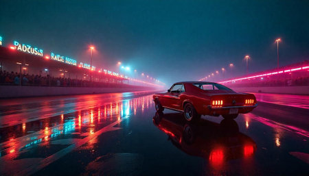 3D rendering of a racing car on the road at night.