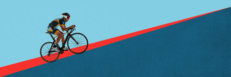 Young man cycling towards the hill on bike. Marathon preparation. Speed and endurance. Contemporary art collage.