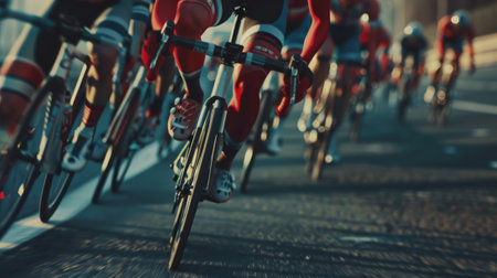 A group of cyclists are racing down a road. Concept of competition and excitement as the riders pedal their bikes. The cyclists are wearing red and white outfits